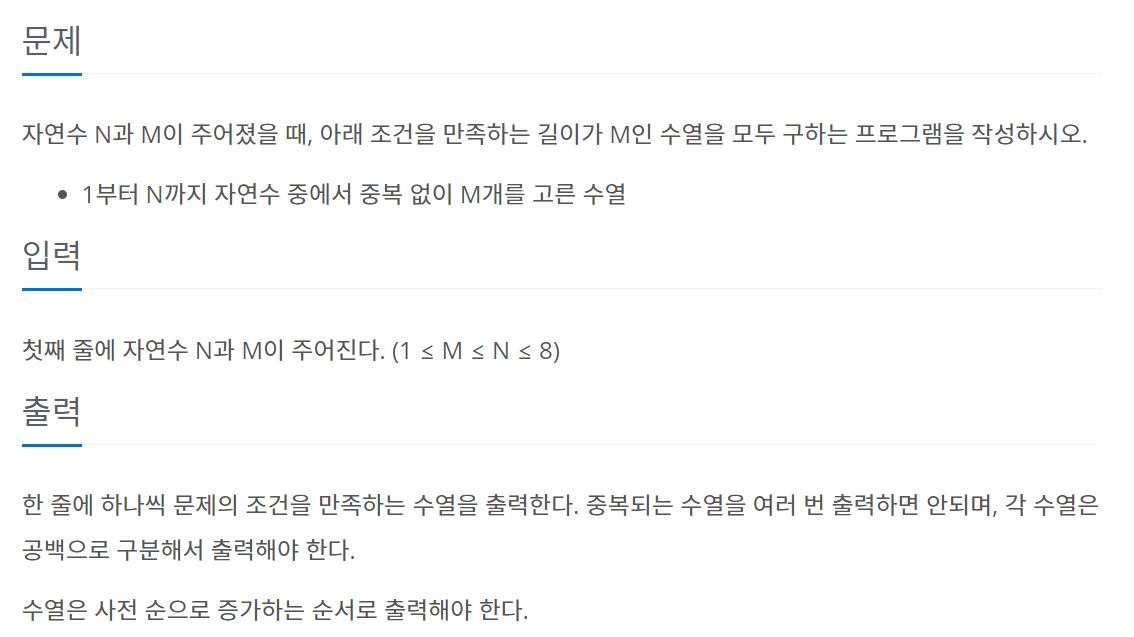 비어있는 리스트에서 시작해서 수를 하나씩 추가하면서 길이가 M인 수열을 완성되면 출력하는 방식으로 구현할 수 있습니다. 하지만 이걸 구현한다고 하면 사실 감이 잘 안옵니다.